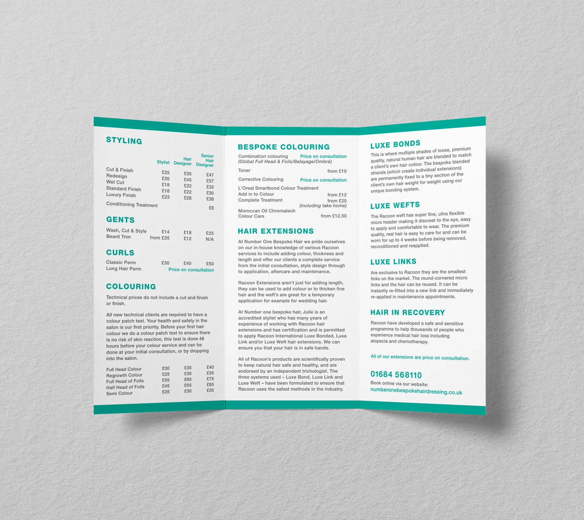 Teal, grey and white tri-fold double-sided price list design created for a local beauty and hair salon based in Great Malvern, Worcestershire.